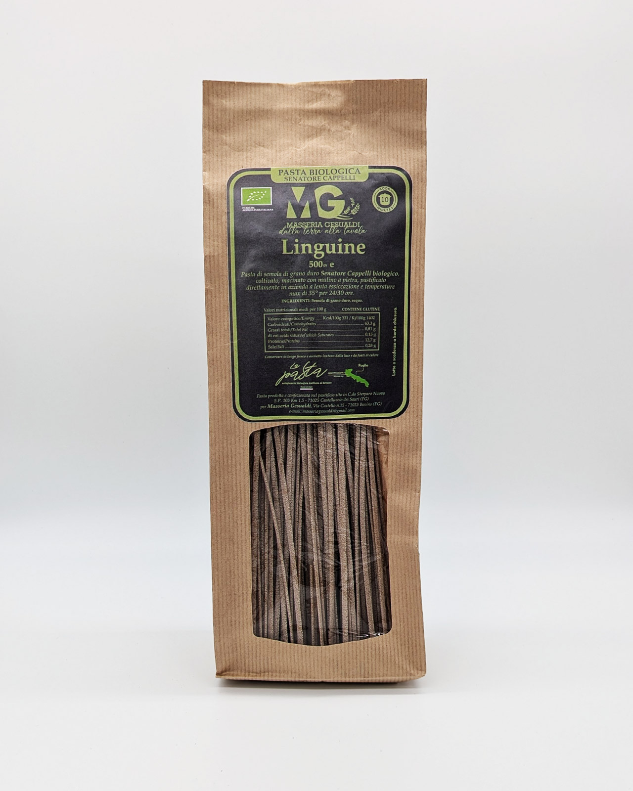 Un’eccellenza italiana per la tua tavola, i nostri linguine sono realizzati con grano biologico Senatore Cappelli, una varietà pregiata di grano duro coltivata senza l’uso di pesticidi o sostanze chimiche. Il grano viene macinato con un tradizionale mulino in pietra, una tecnica che preserva tutte le proprietà nutritive e il sapore autentico del cereale.