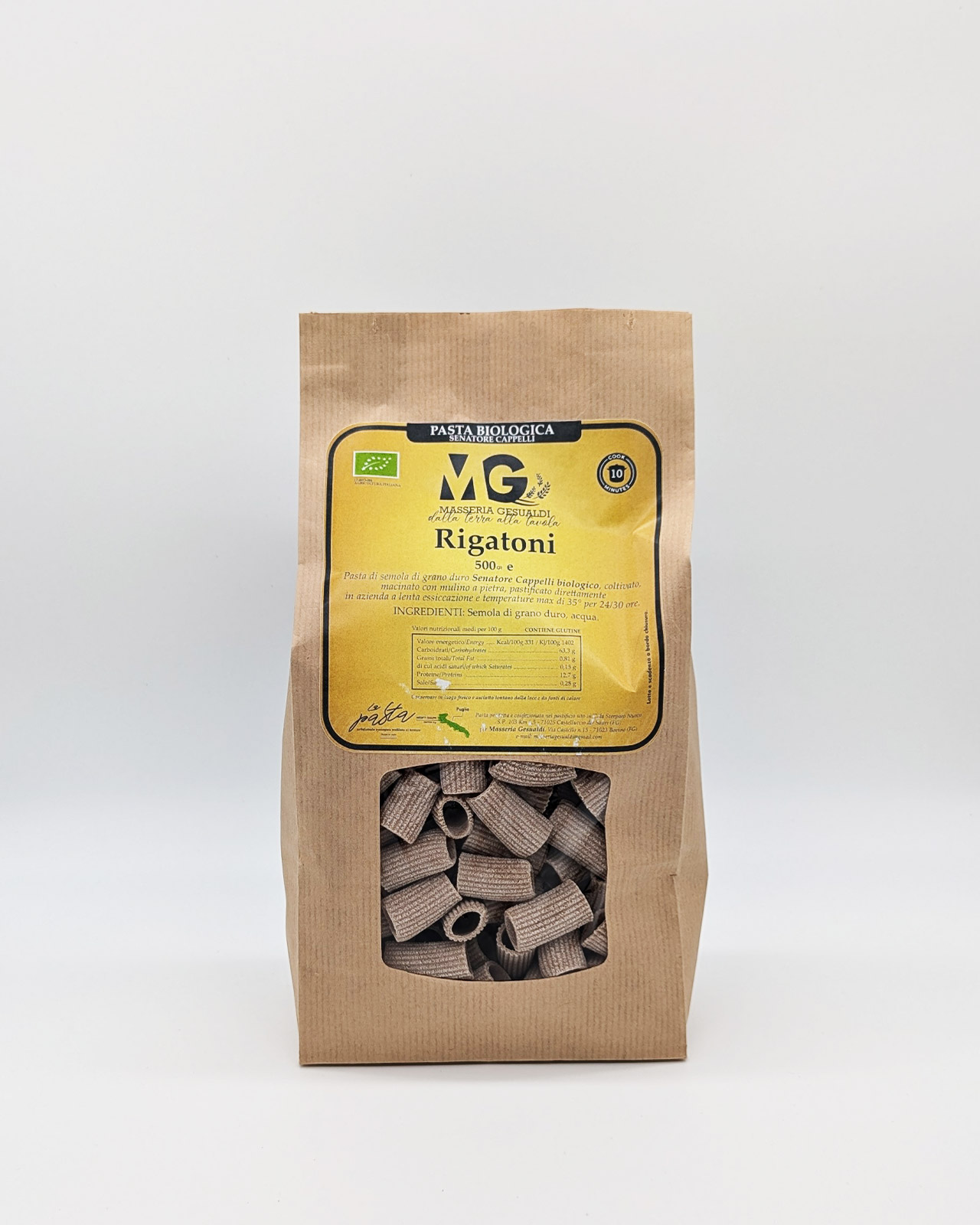Un’eccellenza italiana per la tua tavola, i nostri paccheri sono realizzati con grano biologico Senatore Cappelli, una varietà pregiata di grano duro coltivata senza l’uso di pesticidi o sostanze chimiche. Il grano viene macinato con un tradizionale mulino in pietra, una tecnica che preserva tutte le proprietà nutritive e il sapore autentico del cereale.